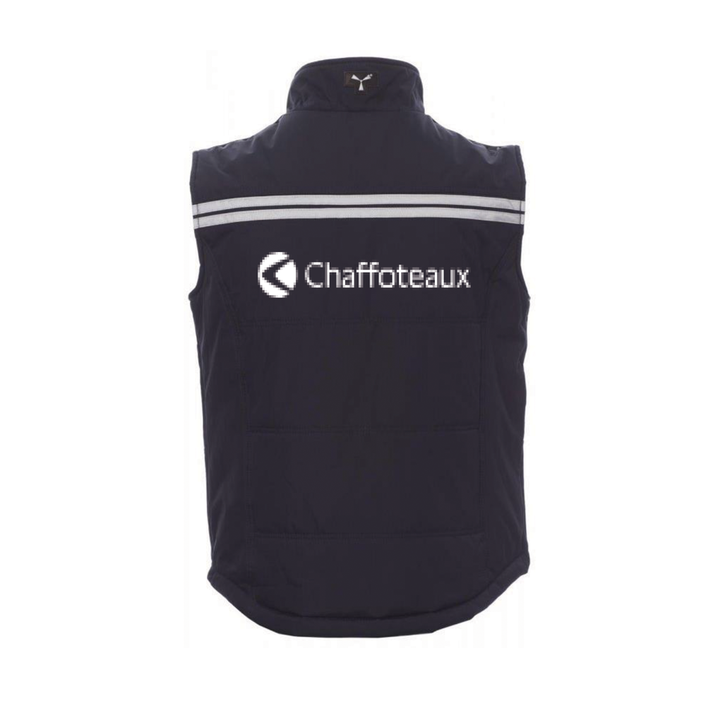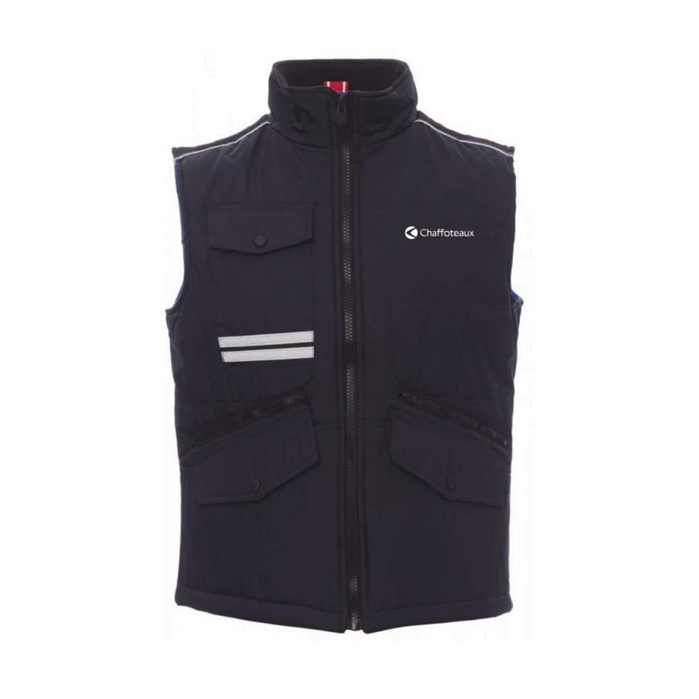 Gilet unisex, zip 8mm in plastica con cursore in metallo con patta e bottoni in plastica, retro sagomato, due tasche esterne LOCK SYSTEM e due con zip, inclinazione delle tasche per agevolare l’ingresso della mano, una tasca al petto porta smart phone e anella porta badge, bande riflettenti sulla tasca e schiena. Interno: imbottito, pile in contrasto su schiena e collo , una tasca, zip interna per agevolare stampe e ricami.